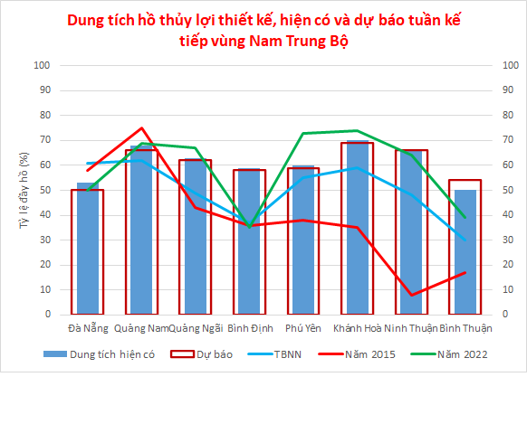Tuần qua, từ ngày 22/6 đến 28/6/2023 khu vực các tỉnh vùng Nam Trung Bộ có mưa nhỏ với lượng mưa phổ biến < 20 mm, cục bộ một số khu vực thuộc tỉnh Bình Định, tỉnh Bình Thuận có mưa vừa với tổng lượng mưa phổ biến từ 60÷150 mm Lượng nước trong các hồ chứa thủy lợi đạt từ 50÷70% dung tích thiết kế (trung bình giảm khoảng 2% so với tuần trước), cao hơn TBNN khoảng 11% Nguồn nước hiện tại cung cấp cho cây trồng nhìn chung đảm bảo Tuy nhiên vẫn có nguy cơ xảy ra hạn hán, thiếu nước cục bộ, xâm nhập mặn với tổng diện tích bị ảnh hưởng khoảng 3600÷7500 ha trên địa bàn các tỉnh Quảng Nam, Quảng Ngãi, Bình Định, Phú Yên, Ninh Thuận và Bình Thuận